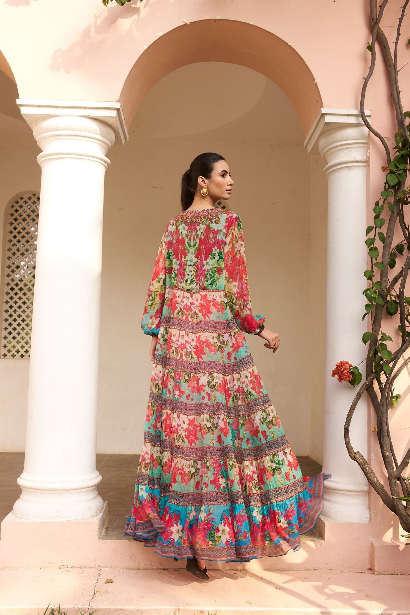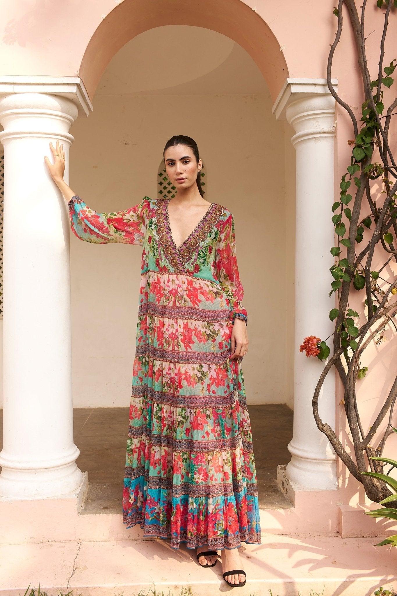 Embrace the beauty of summer in our Blossom breeze vn shirred maxi dress. Adorned with hand-embellished crystals, this chiffon floral print dress exudes elegance. Lined with soft cotton, its tiered design and elasticized waist provide a comfortable and flattering fit. Make a statement with its luxurious blue and pink hues.
