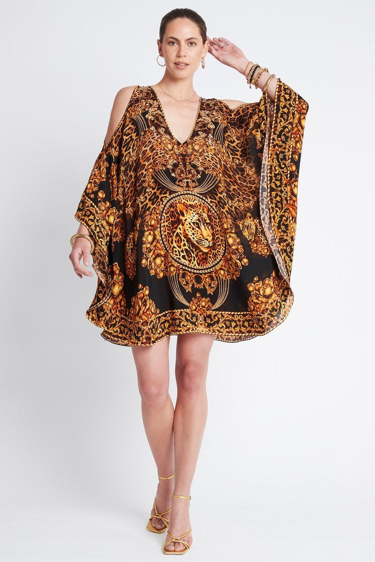 The Golden Lady Kaftan Dress is a signature Czarina shape featuring v-neck, floaty square sleeves with a dropped arm hole and border detailing throughout. If you’re a fan of a kaftans, you won’t want to miss this. Styles effortlessly as a mini dress with flats or heels, or style with skirts and pants.