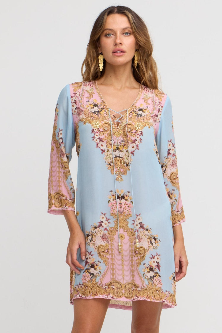 Indulge in the playfully embellished Dusk Till Dawn Tunic. Its v-neck and relaxed fit give you the perfect blend of comfort and style. The hand-embellished crystals and luxurious viscoses silk fabric in soft pink and blue with gold accents will elevate your wardrobe. (Elevate your wardrobe - Do not use!)