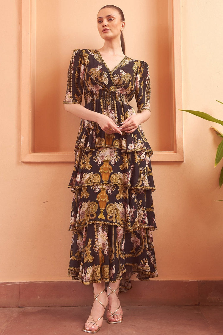For an elevated look, the Golden Girl Cross Over Maxi Dress is the perfect choice. Crafted with luxurious black floral print on a silky viscose fabric, it is hand embellished with crystal details. An A-line silhouette and ruffled design complete the look, with a v-neck and voluminous puff sleeves. An exclusive piece that combines opulence and elegance.