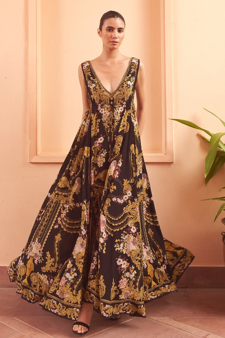 Experience effortless elegance with the Lost in Paradise maxi dress. Intricately hand-embellished with crystals, this luxurious Viscose Silk dress features a delicate Black Floral print and an A Line silhouette for a relaxed fit. Adjust the waist drawstring for the perfect fit and enjoy the comfort of the thick straps. Feel beautiful, inside and out.