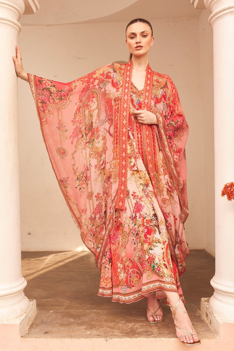 Crafted with luxurious and lightweight chiffon fabric, this beautiful Lotus Bloom Medium Cape is the ultimate statement piece. The ethereal pink hues and intricate floral print are hand embellished with sparkling crystals, creating a graceful and sumptuous look. Offering an open-style design and relaxed fit, this midi-length cape is perfect for special occasions.