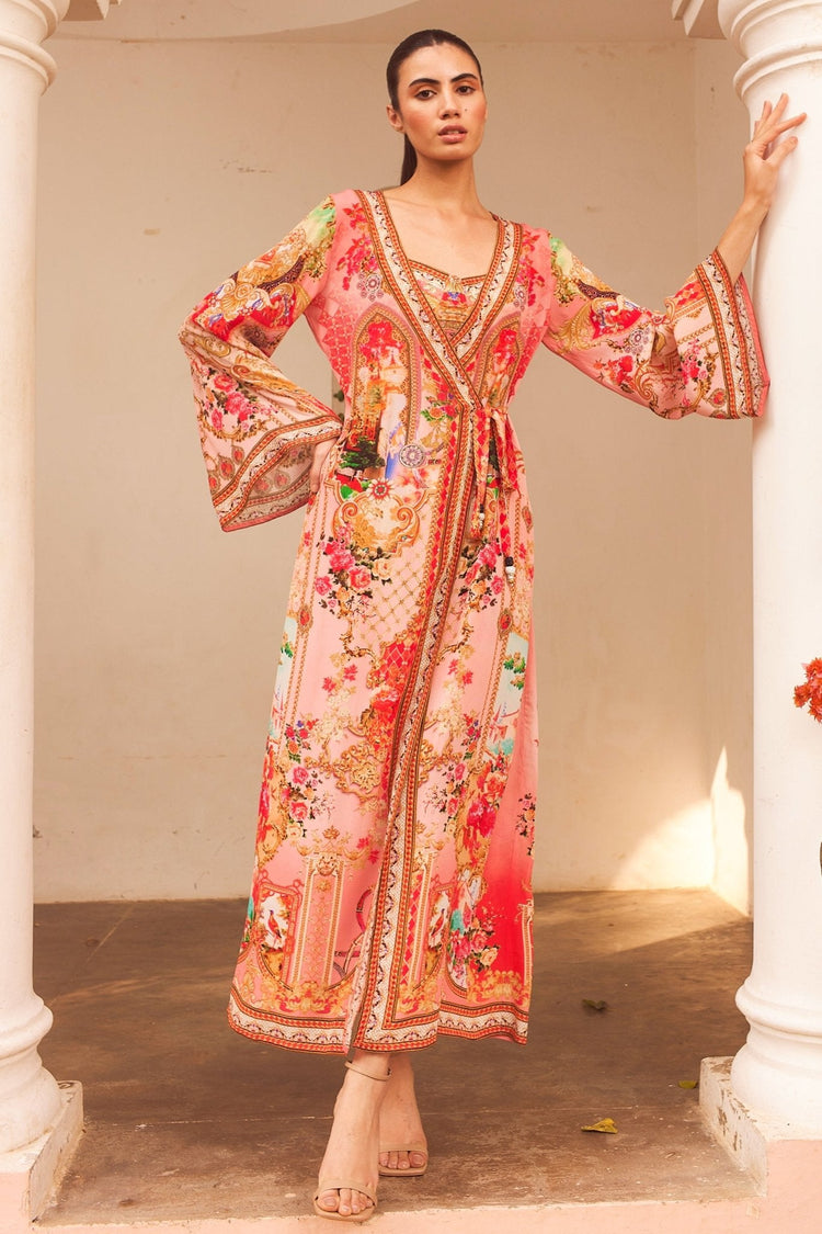 An exquisite wrap dress from our LOTUS BLOOM collection is crafted from the finest Viscose Silk with a beautiful floral print and a stunning combination of pink hues. Delicately hand-embellished with crystals, this sophisticated statement piece comes with bell sleeves and a waist closure for extra comfort. Add instant luxury to any occasion with this must-have design.