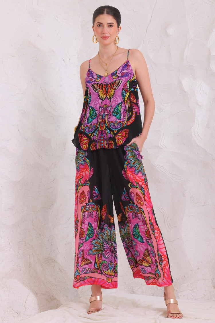 This two piece set features a fierce leopard print and is hand embellished with sparkling crystals. The Cami top has adjustable straps and is relaxed fit, while the trousers have an adjustable waist drawstring and convenient side pockets. Made from luxurious viscose silk, this set will have you feeling confident and stylish in any setting.