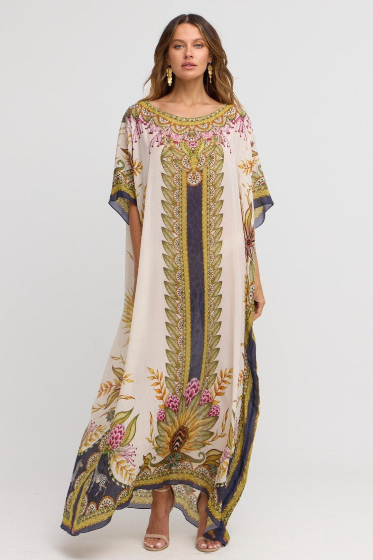 Introducing our Princess of Savannah kaftan, hand embellished with sparkling crystals. Made from luxurious viscose silk with a mesmerizing savannah print on a white base. The round neckline and long length add to its elegance and make it a perfect fit for all. Make a statement with this one-size kaftan.