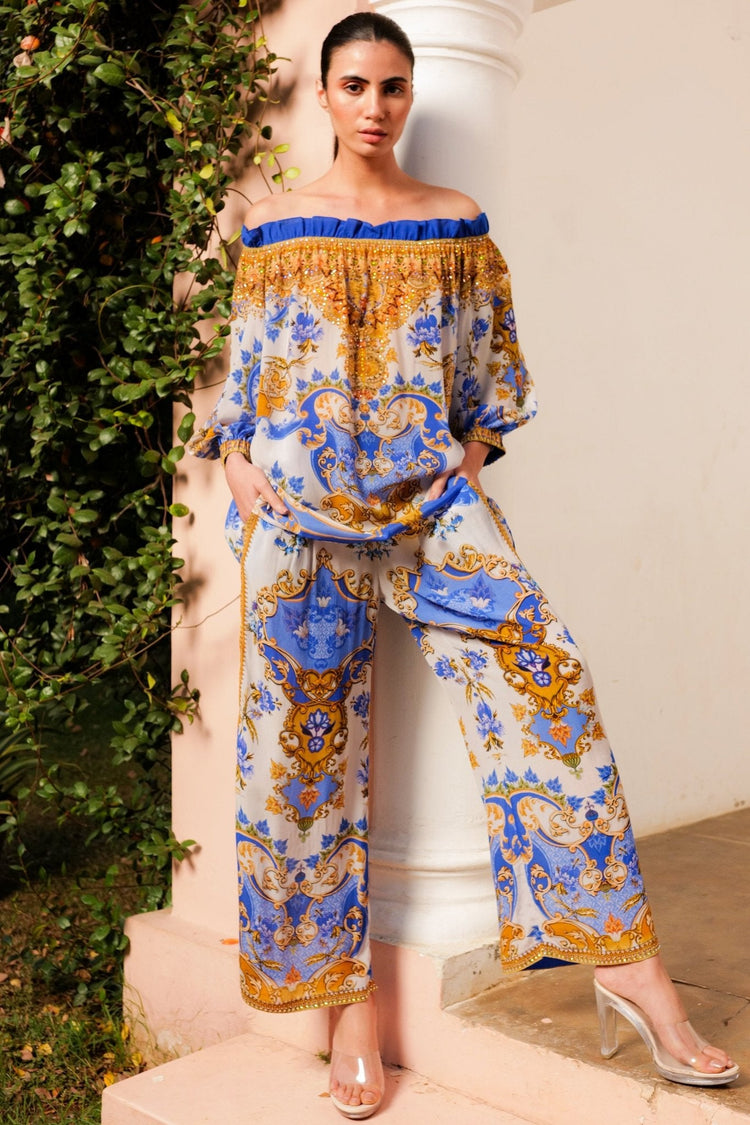 "Get ready to turn heads with our Santorini Sun Kiss Off Shoulder Top! Made from a luxurious blend of viscose silk, this top features a stunning white color with blue and gold accents. The elasticized neck adds a relaxed yet stylish touch, while hand-embellished crystals provide a touch of glamour. Perfect for a day at the beach or a night out on the town."