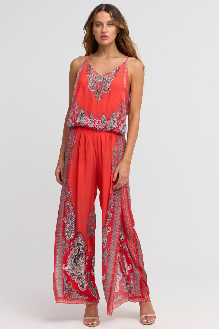 Unleash your fiery side with our Spicy Margarita Jumpsuit! This vibrant piece features hand-embellished crystals, adjustable straps, and a relaxed fit. The paisley motifs and wrap around pant style add a touch of whimsy, while the soft viscose silk and waist tie ensure comfort and a perfect fit. Time to spice up your wardrobe!