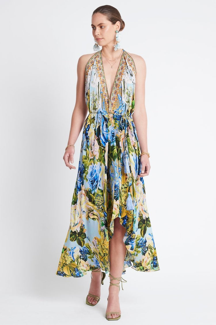 Experience the Bloom Garden 3-Way Dress, a versatile essential with a Czarina twist. Wear it in multiple ways, from a low-cut V-neckline to a chic one-shoulder style. Inspired by the colours of summer, it features heavenly soft blues and yellow tones. Style it simply with sandals or layer it added elegance. Perfect for your next holiday or to elevate your everyday wardrobe.