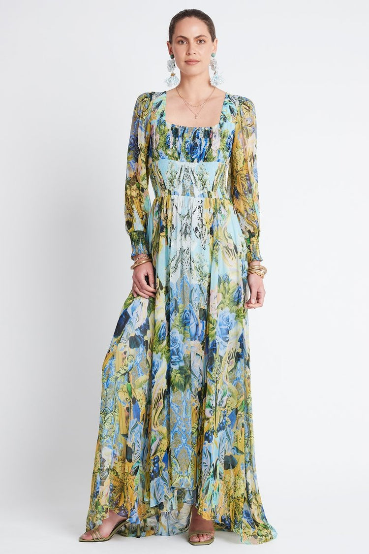 Embrace summer vibes with the Summer Blues Off Shoulder Maxi Dress from Czarina. This new shape features a beautiful neckline that can be worn on or off the shoulders. The cascading gathered tiers and balanced print placement create a flattering silhouette. The blue and yellow print exudes high summer vibes, perfect for pairing with glowing skin and layers of jewelry. Style it with flats or sandals for a daytime look, or dress it up with boots or heels for a night out. Wear it belted or loose, and enjoy the spirit of summer in style.