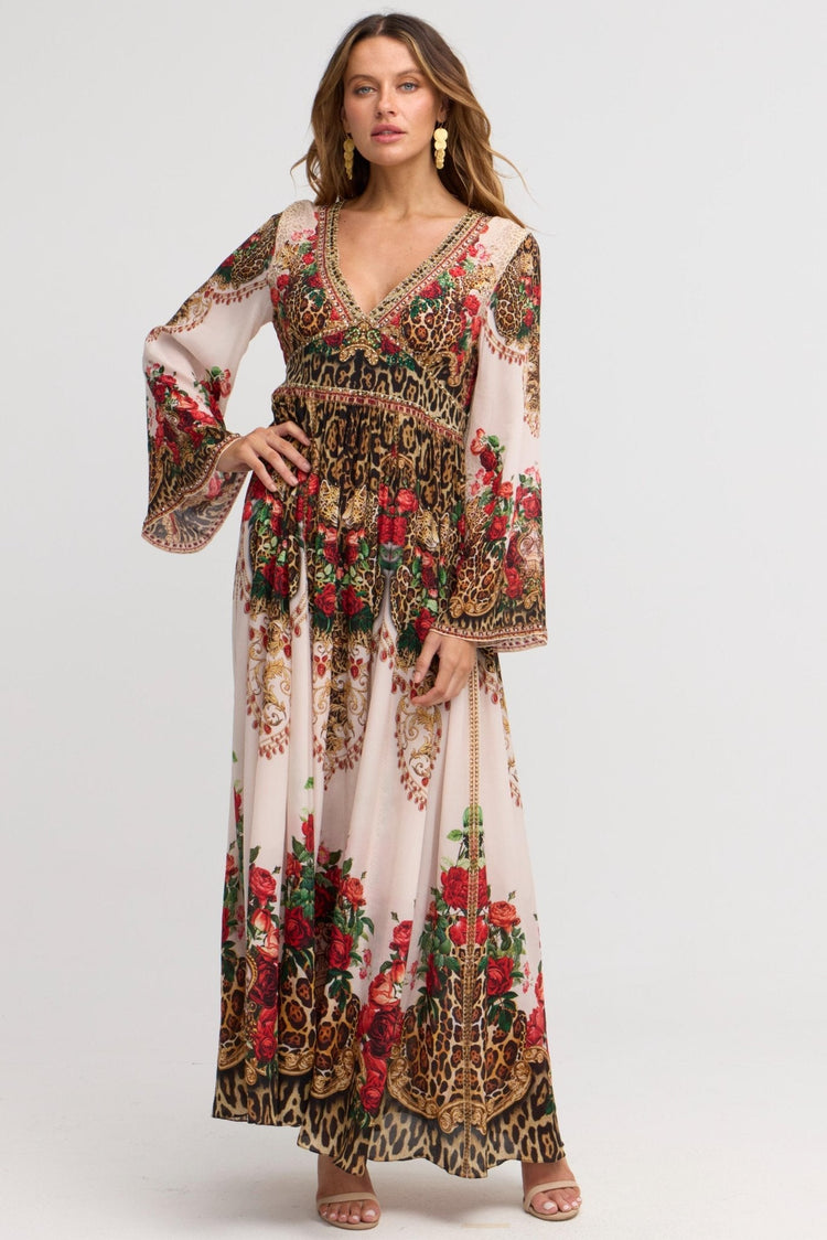 Make a statement in the White Leopardess Maxi with Flare Sleeves. Crafted from luxurious viscose silk, this A-line maxi dress features a white base adorned with leopard print, roses, and gold accents.