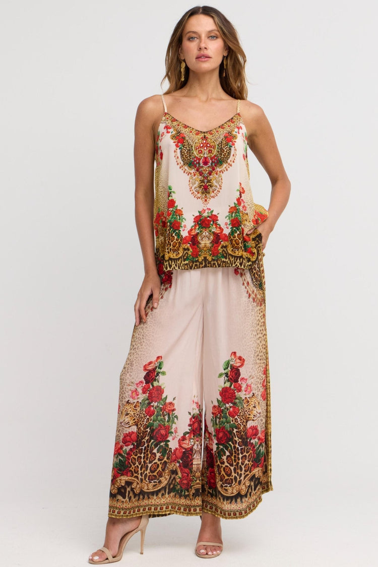 Step into effortless elegance with the White Leopardess Trousers. Featuring a white base with a bold leopard print, roses, and gold accents, these relaxed-fit trousers blend comfort and glamour.